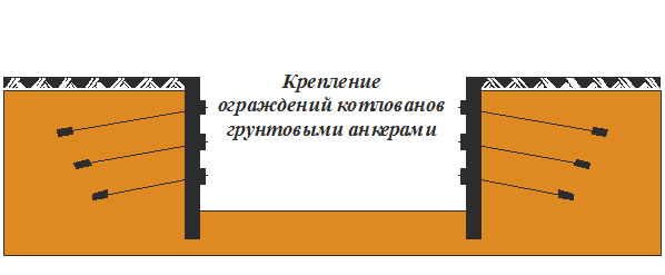В глубоких и широких котлованах анкерное крепление является самым эффективным по цене и скорости устройства. Оно возводится быстро и главное — позволяет иметь котлован, свободный от временных конструкций, подкосов, распорок, мешающих разработке грунта и последующему строительству.