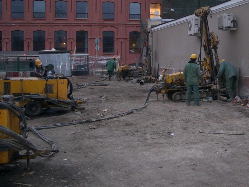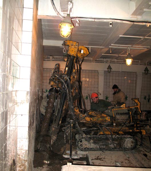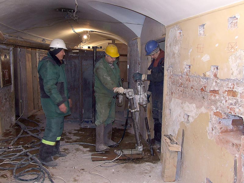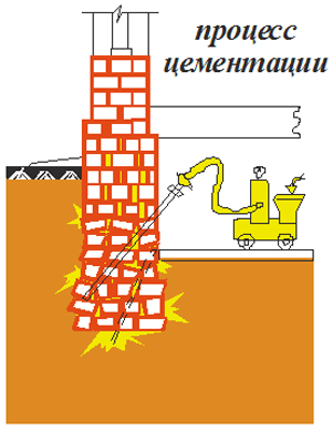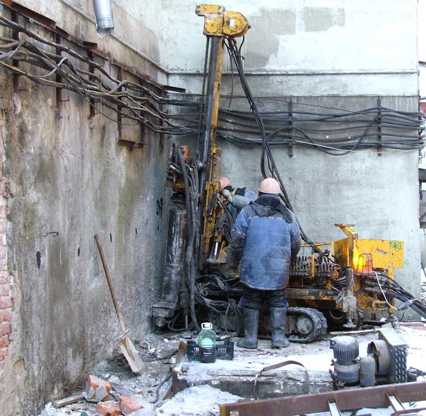 Цементация фундаментов проводится при ослаблении фундаментов и разуплотнении грунта под его подошвой. В тело фундамента и на контакт «фундамент-грунт», через специально пробуренные скважины диаметром 40 – 110 мм, под строго контролируемым давлением, подается твердеющий раствор, приготовленный на основе цементов. В результате отсутствующий кладочный раствор заменяется новым, фундамент приобретает прочность, пустоты под подошвой заполняются, повышается плотность грунтов основания. Для минимизации воздействия на кладку фундаментов при проведении цементационных работ мы используем алмазный буровой инструмент и пневмоударники малого диаметра английской фирмы “HALCO”. Такая щадящая технология позволяет выполнять работы на зданиях - памятниках архитектуры