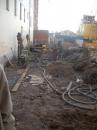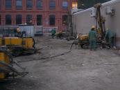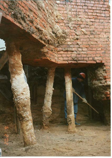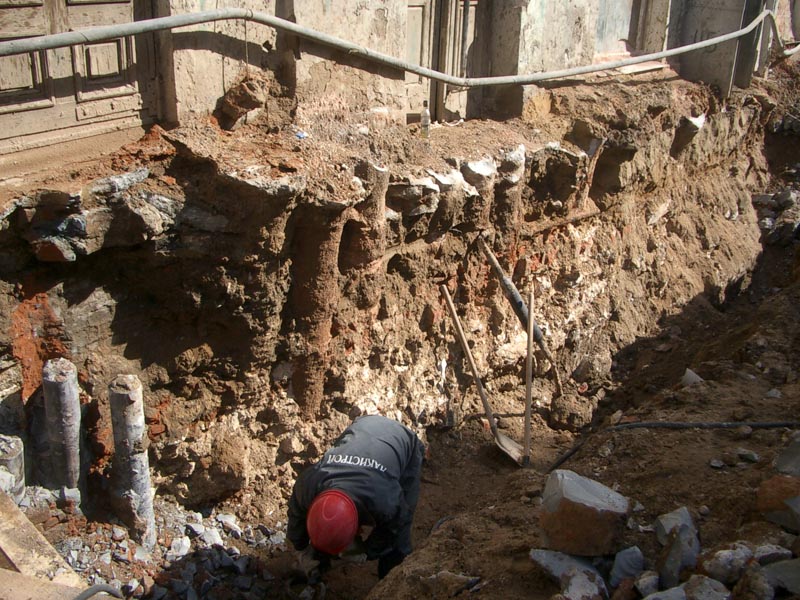 Для минимизации опасных последствий от деформации здания при заглублении подвалов, мы используем метод «вывешивания». Заключается он в переносе здания с ленточного на свайный фундамент, но в отличие от обычного усиления на сваи передается полный вес здания, что требует точного проектного расчета и особой тщательности при выполнении. Чтобы исключить потерю устойчивости свай, в них применяют дополнительное усиленное армирование верхней, самой нагруженной части. Перед устройством свай фундамент также подвергается укреплению методом цементации. После проведения данных мероприятий можно выполнять разработку грунта и подведение новых стен ниже уровня существующих фундаментов.