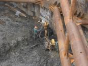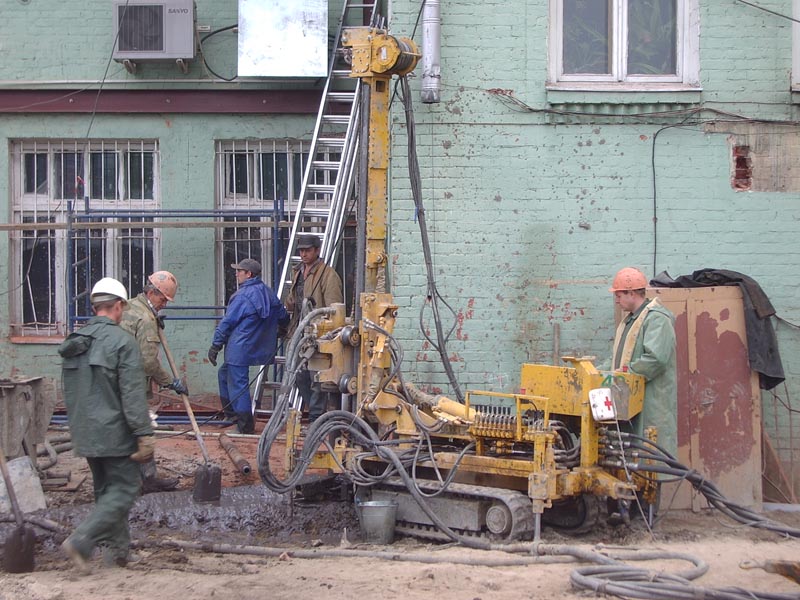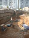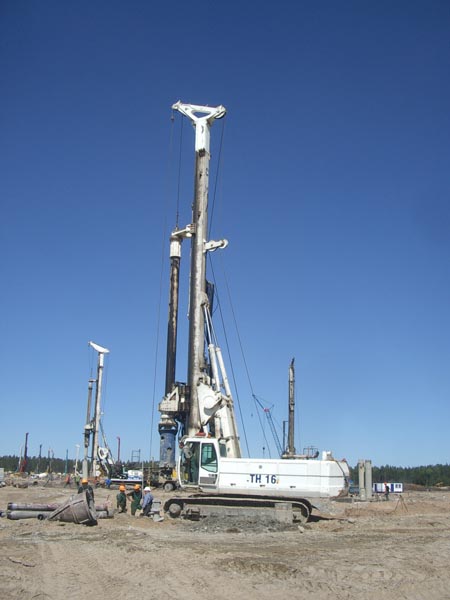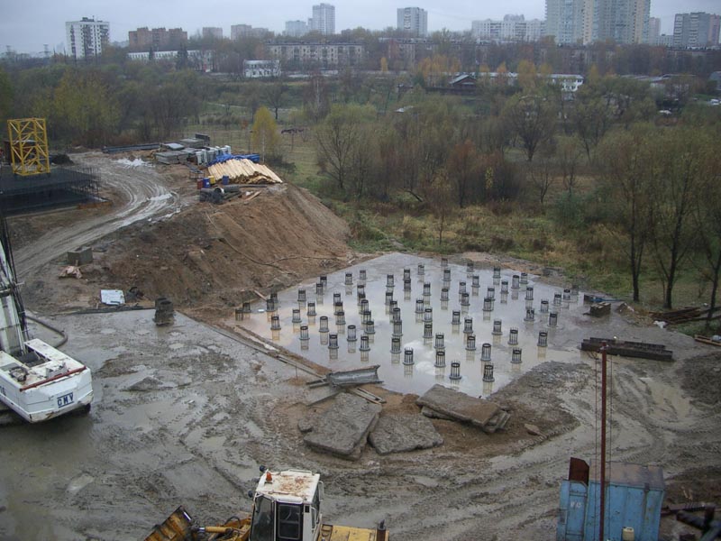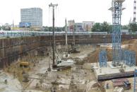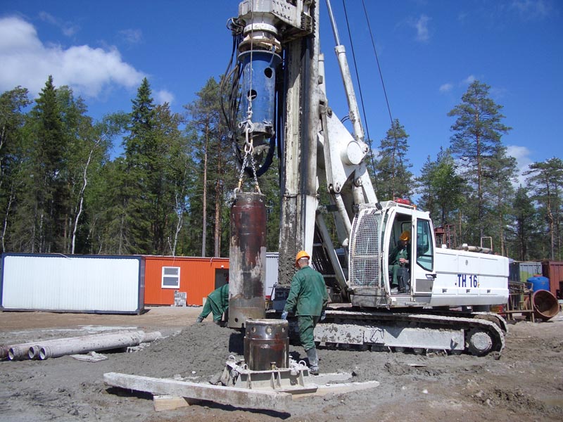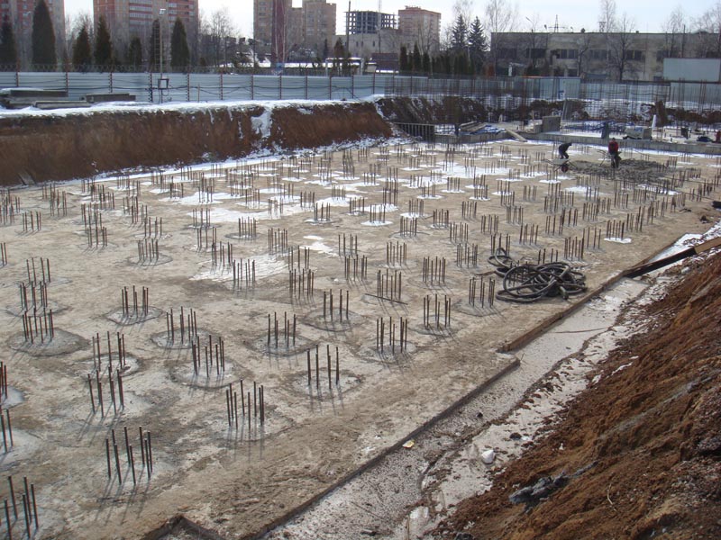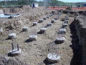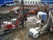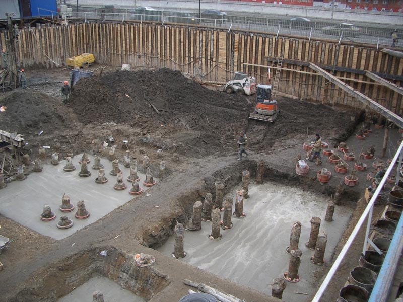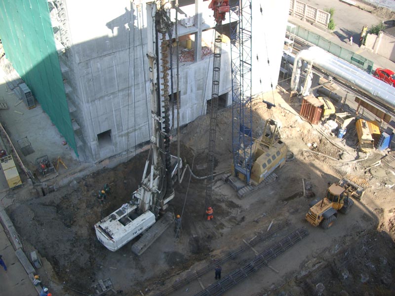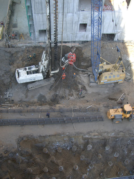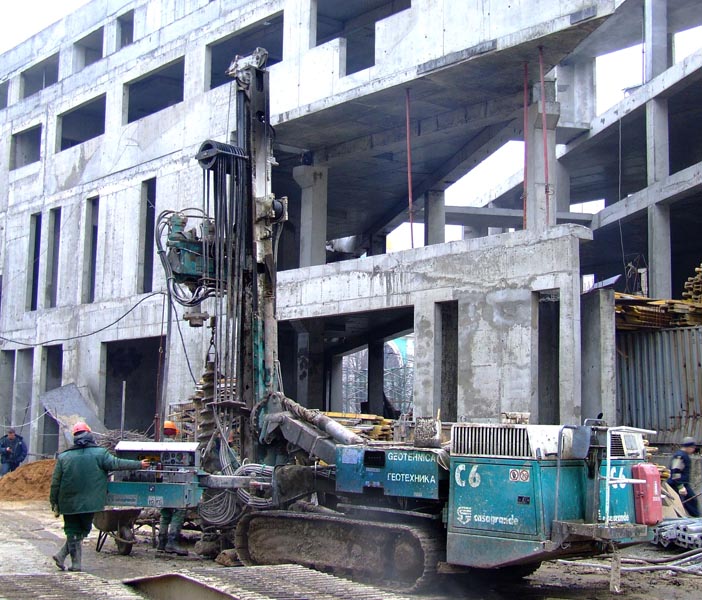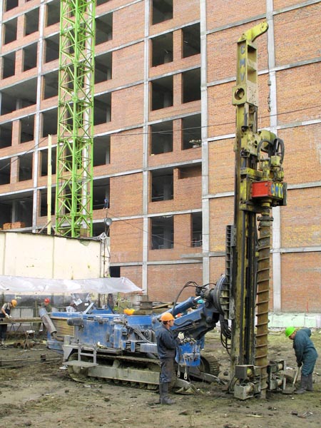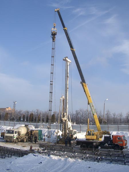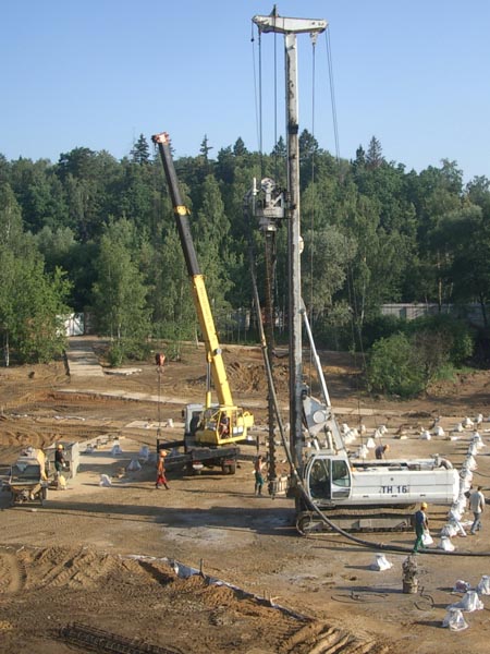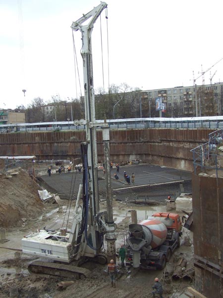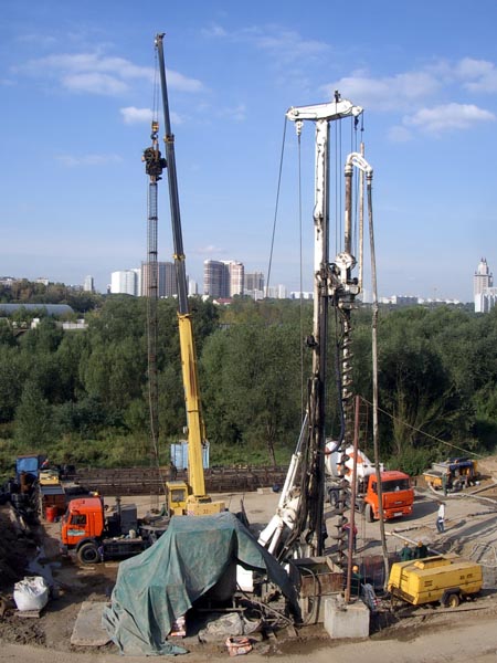- буровые сваи используются в качестве фундаментов зданий, ограждения котлованов и подпорных стен; Для устройства сваи бурится скважина необходимого диаметра и длины, затем ствол скважины заполняется бетоном и в еще подвижный бетон устанавливается арматурный каркас. Или наоборот, сначала в скважину устанавливается каркас, а потом пространство вокруг него заполняется бетоном. Последовательность операций зависит от выбранной технологии. |